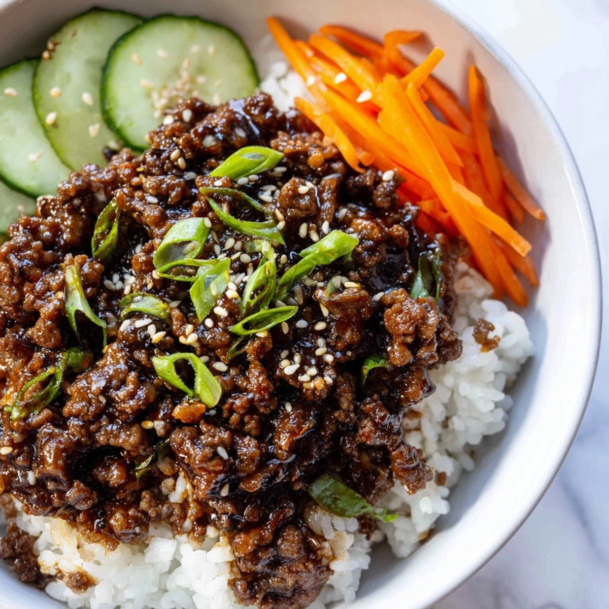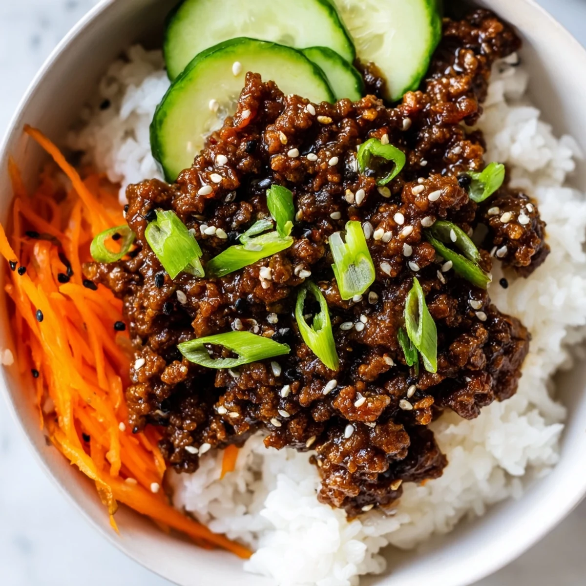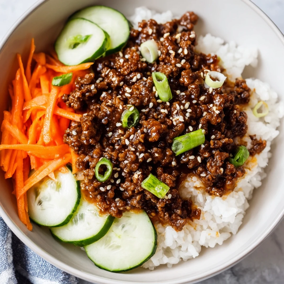 These satisfying bowls feature lean ground beef cooked in a savory-sweet sauce with soy, sesame, garlic, ginger, and gochujang for authentic Korean-inspired flavor. The beef is served over fluffy steamed rice and topped with crisp julienned carrots, refreshing cucumber slices, scallions, and toasted sesame seeds for added texture and freshness.