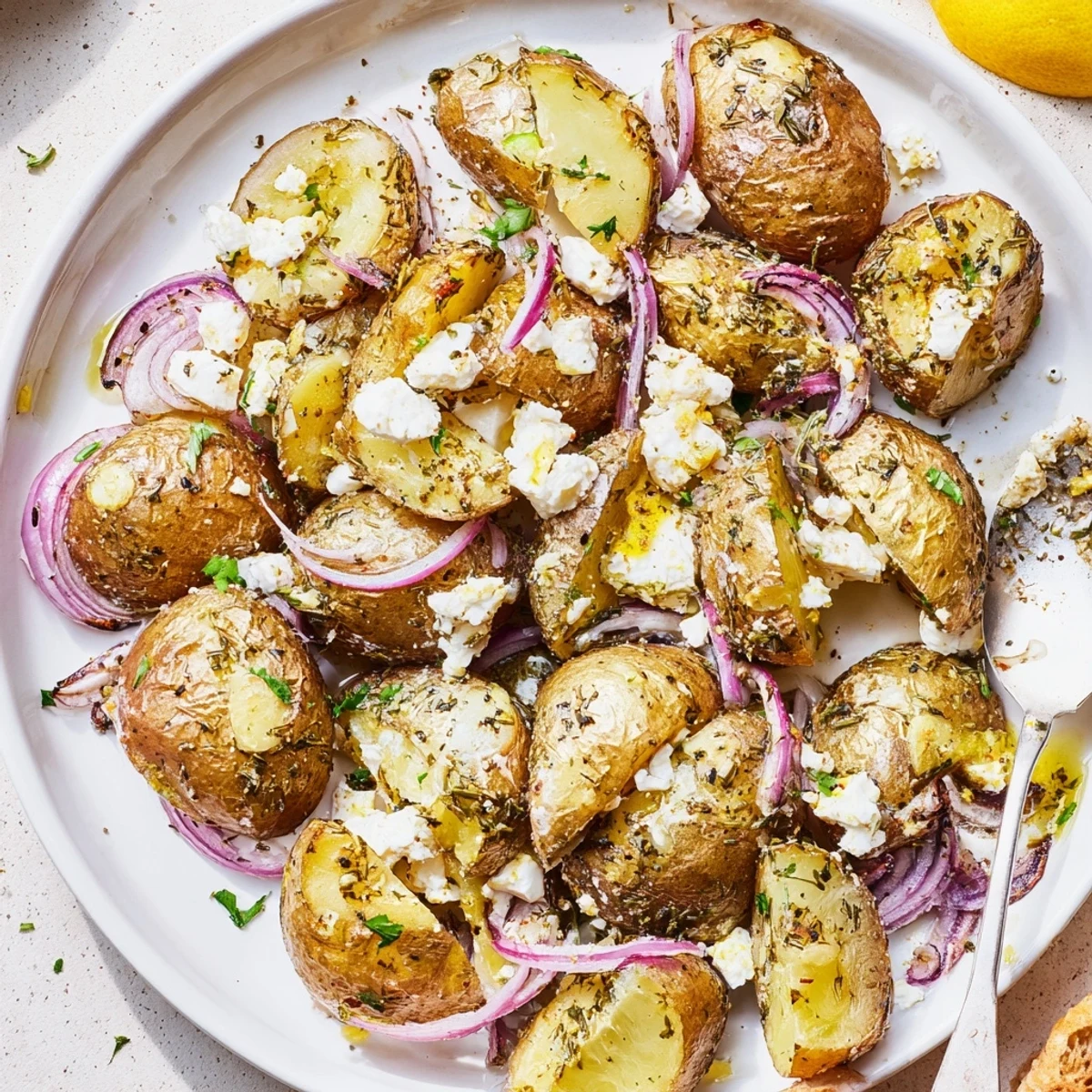 Baked until golden, halved baby potatoes are tossed with olive oil, minced garlic, sliced red onion, oregano, thyme, salt and pepper, then roasted at 200°C (400°F) for 25–30 minutes until tender. Crumbled feta is scattered on top and returned to the oven 10–12 minutes until soft and lightly browned; a short broil adds extra color. Finish with lemon zest and parsley. Serve warm alongside grilled proteins or a crisp salad; serves four.