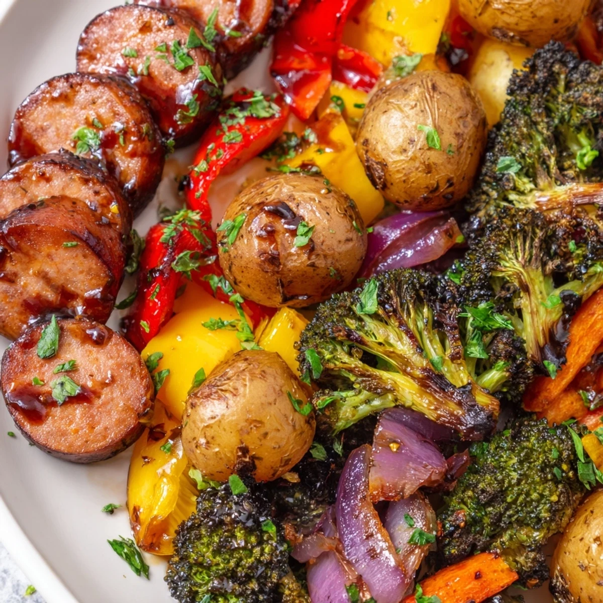 Transform simple ingredients into a spectacular dinner with this one-pan approach. Smoky kielbasa sausage pairs beautifully with baby potatoes, broccoli florets, bell peppers, red onion wedges, and sliced carrots. The honey garlic glaze—featuring honey, olive oil, minced garlic, soy sauce, and Dijon mustard—creates a perfect balance of sweet and savory flavors that coats everything in sticky deliciousness.