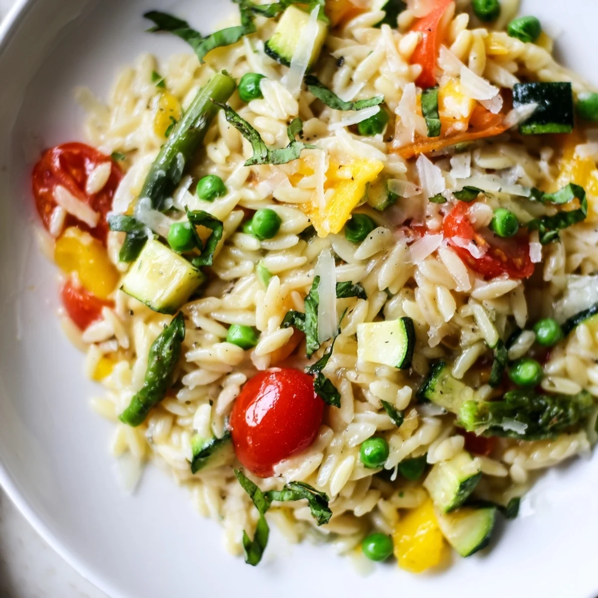 This vibrant Italian-inspired dish combines tender orzo pasta with a colorful medley of fresh spring vegetables. The orzo cooks in just 10 minutes while crisp-tender zucchini, cherry tomatoes, bell pepper, asparagus and peas sauté separately with fragrant garlic.