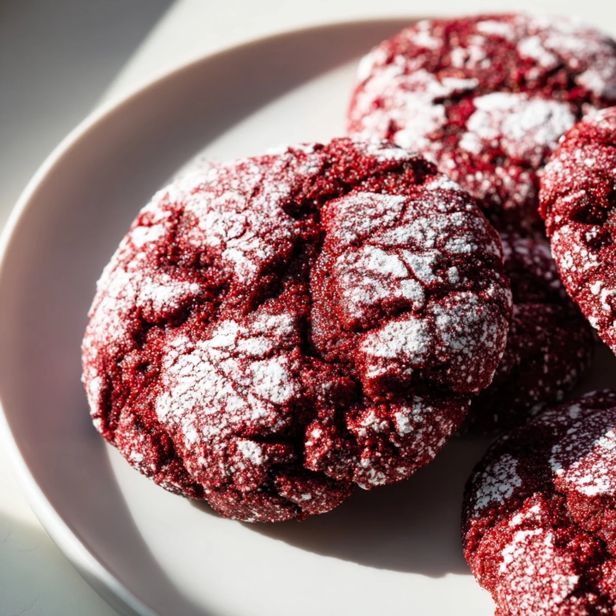 The snow was falling outside my kitchen window when I first decided red velvet cookies were exactly what a cozy December afternoon needed. Id been seeing them all over social media, that stunning contrast between the bright red dough and snow-white powdered sugar cracks, and I couldn't resist any longer. My kitchen ended up looking like a crime scene with red food coloring splattered everywhere, but pulling that first tray from the oven made every bit of the mess worth it.