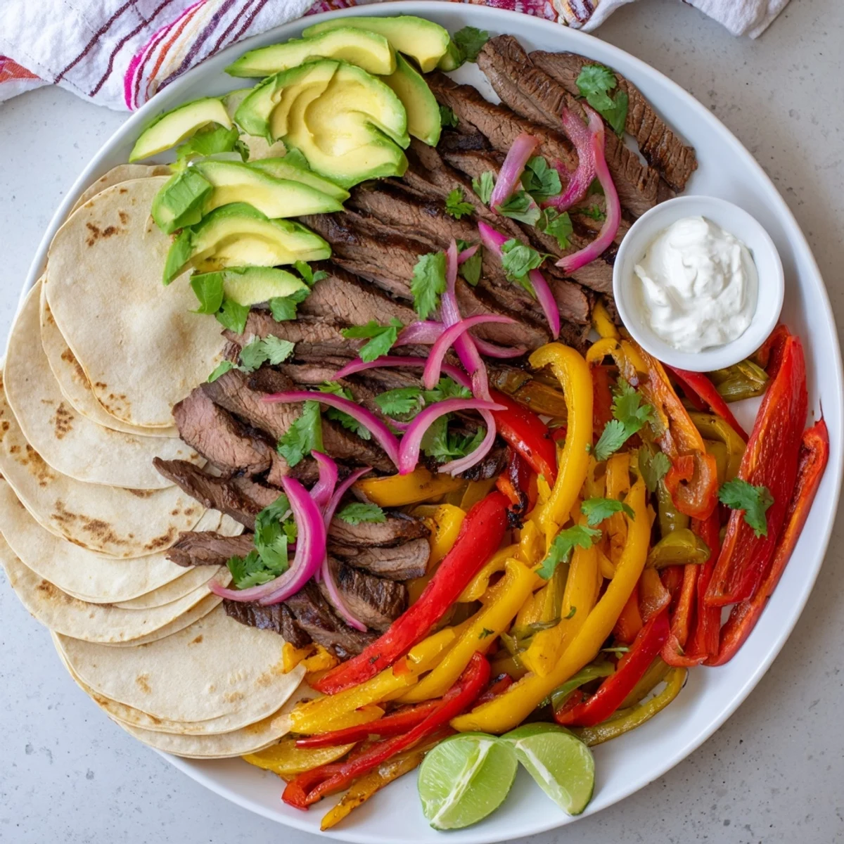 The key to a great fajita is balance between all the components. Start with a layer of meat and vegetables, then add your cool elements like sour cream and avocado. A squeeze of fresh lime right before folding everything together brightens all the flavors. Do not overstuff the tortilla or you will end up wearing half your dinner.